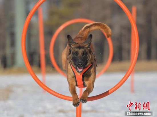 搜救犬正在進(jìn)行跳圈訓(xùn)練。