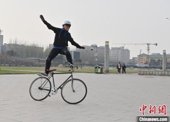 4月24日,在長春市文化廣場內,64歲的市民周長春表演自行車花樣絕技。站立騎行、脫把騎行等一系列驚險刺激的動作被周長春完成得十分精彩,吸引市民圍觀。